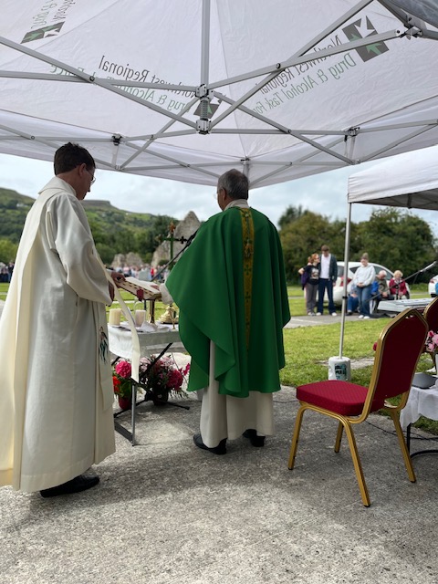 Approximately 400 people attended Mass and the Blessing of Graves, in pleasant weather conditions, at the site of Gubalaun (St Maedhog’s) Abbey in Rossinver, Co. Leitrim, on Sunday 3 August last. Bishop Martin Hayes was the principal celebrant of the Mass and was assisted by Fr John Sexton, Administrator of the local parish of Ballaghameehan-Kiltyclogher.